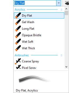 Hovering over a style in the Brush picker displays a preview of the stroke's characteristics, such as shape, texture, and transparency.
