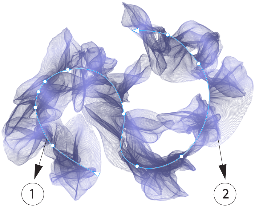 Selecting a Painterly brushstroke with an Edit shape tool like the Shape tool in this example lets you adjust the path of the stroke (1) by using the nodes and control handles; selecting the stroke with the Painterly Brush tool lets you modify the size and transparency of the pixel brush mark (2).