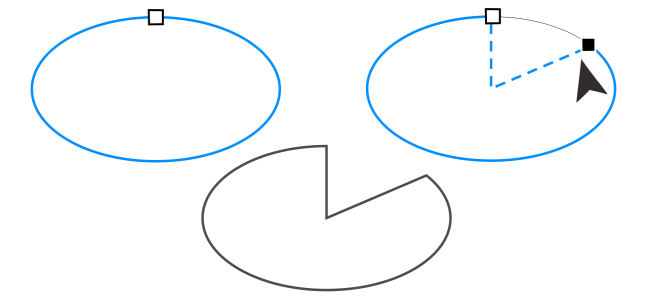 To use the Shape tool to create a pie shape, drag the node of the ellipse (left) to the inside of the ellipse (center). To create an arc, drag the node to the outside of the ellipse (right).