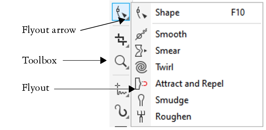 The toolbox contains tools for drawing and editing images. Some of the tools are visible by default, while others are grouped in flyouts. Flyouts open to display a set of related CorelDRAW tools. A small flyout arrow in the lower-right corner of a toolbox button indicates a flyout. You can access the tools in a flyout by clicking the flyout arrow. After you open a flyout, you can easily scan the contents of other flyouts by hovering over any of the toolbox buttons which have flyout arrows.