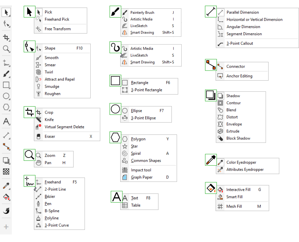 The following illustration shows all flyouts in the default CorelDRAW toolbox and can help you locate tools more easily.