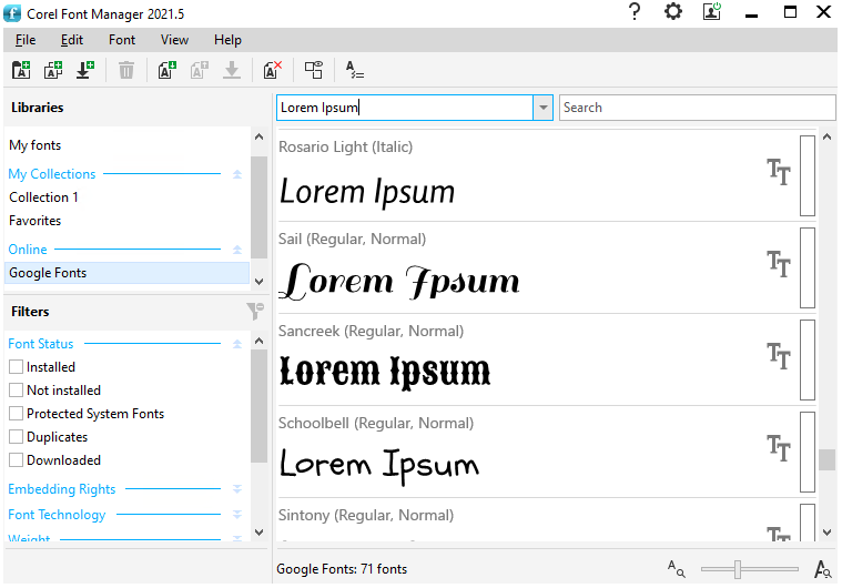 Access more than 1000 font families from the Google Fonts library directly from Corel Font Manager to use in your designs. Browse, search, and preview those online fonts with ease without having to install them. Download or install the fonts you like to access them from the Font list box in CorelDRAW and Corel PHOTO-PAINT.